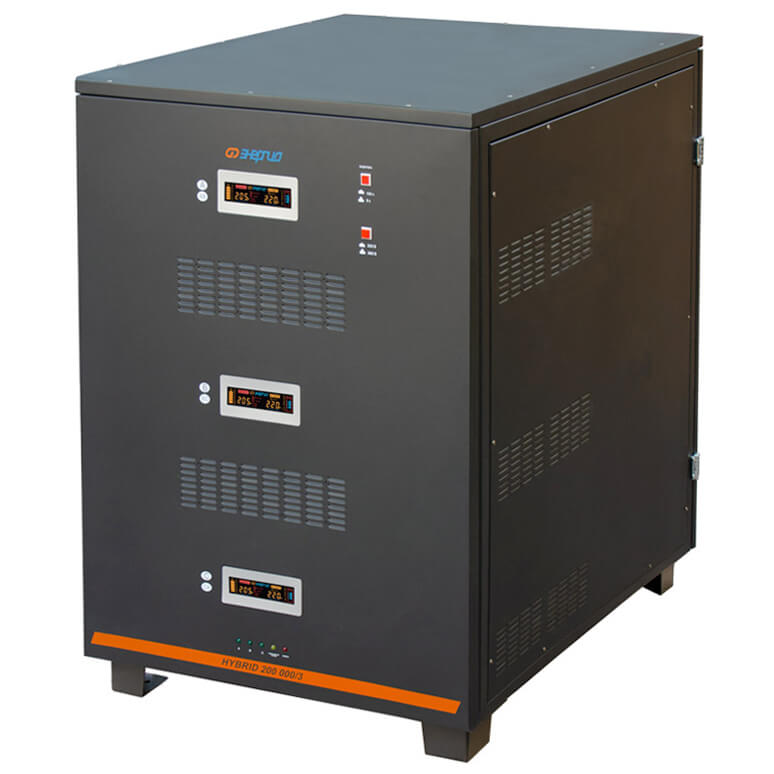 Энергия Hybrid 200000/3 относится к классу гибридных (комбинированных) стабилизаторов и сочетает в себе плавность регулировки электромеханических стабилизаторов и возможность работы на крайне низких напряжениях (до 80В фазного напряжения) электронных. Фактически, в одном корпусе собраны два стабилизатора: электромеханический и электронный, позволяя сочетать лучшие черты обоих типов. Стабилизатор отличается высокой точностью (погрешность всего 3%) и режимом плавной регулировки, обеспечивающий максимально комфортный режим питания для чувствительной техники. Он не искажает синусоидальную форму напряжения и не создает помех при работе, поэтому может использоваться в таких ответственных областях как питание медицинского оборудования, аудио и видео-аппаратуры и других устройств, чувствительных к резким перепадам напряжения и сетевым помехам.